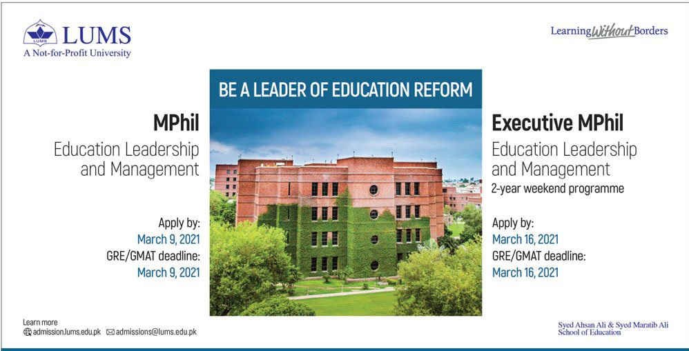 Admissions are open in Lahore University of Management Science for the academic session 2021. They offer admissions in M.phil (Education Leadership and Management) and M.Phil Executive. Applicants who wish to get admission to such prestigious universities will apply today by following general admission criteria. Be a student of this LUMS university and obtain a world-class education. M.Phil Executive is a two-year program and the last date to apply for this program and GRE/GMAT deadline is March 16, 2021. However, for the simple M.phil program, the last date for application submission and GRE/GMAT deadline is 9th March 2021. So, the interested candidate can apply before the last date