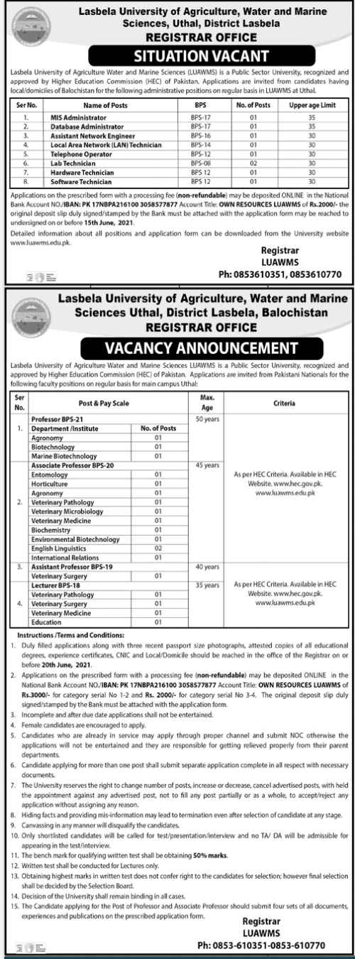 Lasbela University of Agriculture Water & Marine Sciences (LUAWMS) announced various teaching and non-teaching job positions. LUAWMS is a public university recognized and approved by HEC. Thus, eligible candidates can apply for the concerned jobs according to the eligibility criteria. However, for the non-teaching staff, candidates having Balochistan domicile are eligible. While for the teaching jobs, Pakistani candidates can apply. Thus, interested candidates can apply by 15 June 2021 for non-teaching posts and 20 June 2021 for teaching posts.