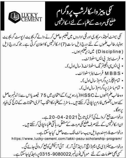 Looking for a scholarship program? If your answer is yes, then you are absolutely at the perfect place. Lucky Cement announced scholarship for the latest undergraduate scholarship program 2020-21.Applicant male and female are highly eligible to apply. They are equal job providers to all candidates who register in the first year of an undergraduate degree. Only candidates who belong to district Lakki Marwat can apply, and candidates who obtained 70% marks in HSSC Annual Board exams are eligible to apply for such posts.