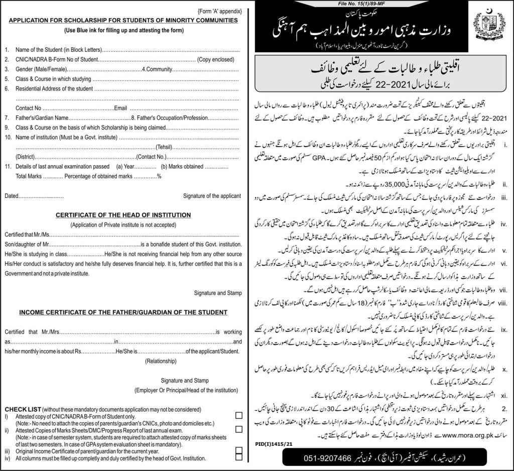 The Ministry of Religious Affairs Pakistan has announced scholarships for Non-Muslims (Minority) students. However, the announced scholarship is for the students studying in Primary to Professional Level degrees. However, candidates must be enrolled in Public institutes. So, qualified applicants can apply by sending the application form till the last date. However, the last date to apply for the Ministry of Religious Affairs scholarships is 04 October 2021.