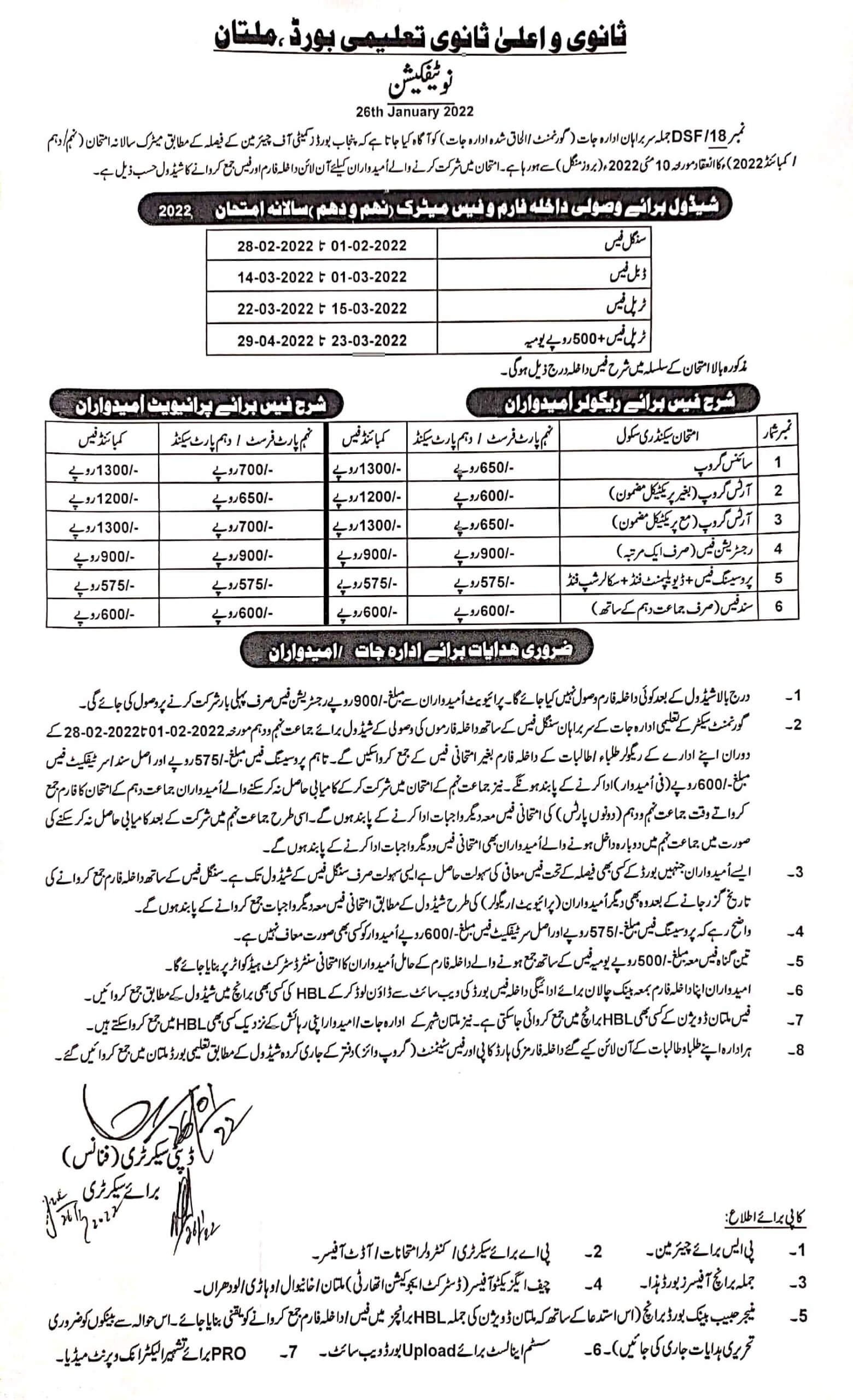 According to the latest Multan board notification, it is to inform you all that the Board of Intermediate and Secondary Education BISE Multan issued a notification regarding the annual exam fee structure 2022. They issued the fee structure of private and regular candidates. An applicant who going to appear in the 9th and 10th class annual examination for the year 2022 will now view the detailed fee schedule from here. . The last date for submitting the admission form with a single fee is 1st Feb 2022 to 28 Feb 2022. At the same time, the date for submitting the admission form with a double fee is 1st March 2022 to 14th March 2022. The triple fee is from 15th March 2022 to 22nd March 2022.