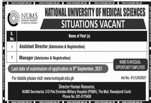 National University of Medical Sciences NUMS announced the latest multiple vacant positions for the year 2021. Both male and female can apply. Candidates belonging to different cities of Pakistan can apply for these vacant positions. NUMS invites applications for high caliber, active and reflective professionals for the post of Manager,Assistant Director . The job position is in Rawalpindi, Pakistan.It is a full-time job. They offer attractive salary packages and offer other fringe benefits as well. The job is on a permanent basis.Applicants having Master degree holders are welcome to apply.
