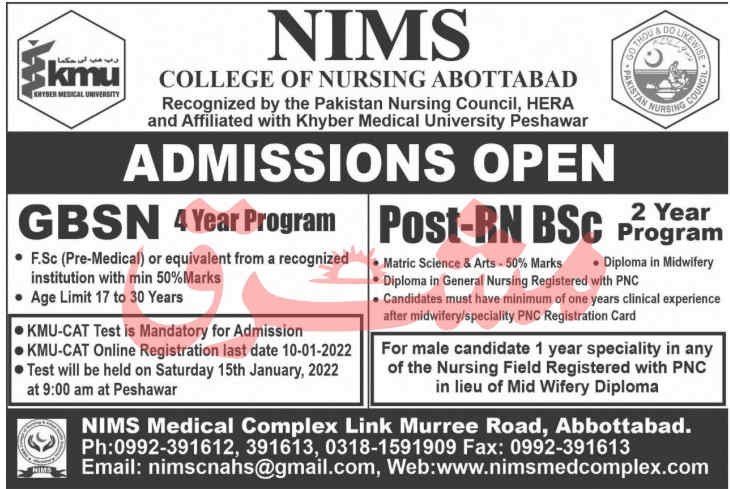 The NIMS College of Nursing Abbottabad announced the admissions 2022 for the following degrees.