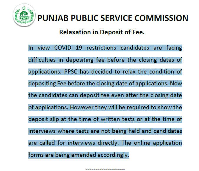 PPSC has announced new career job opportunities. But due to coronavirus, people are unable to deposit fee in bank accounts. They are not allowed to travel anywhere because of lockdown. The police take strict action against those who are not following government rules. Due to these issues, the Punjab Public Service Commission decided for PPSC relaxation in the deposit of fee. According to the details, it is to be notified that the candidates can deposit fees even after the last date. Further details are given below.