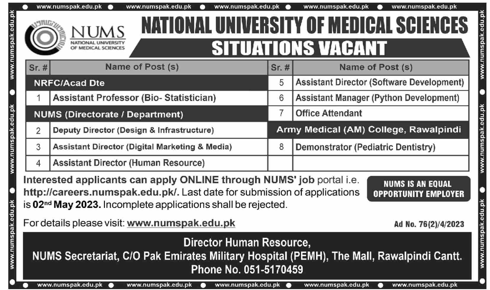 The National University of Medical Sciences (NUMS) announced the latest job positions for various posts. The advertised jobs are for the NUMS Research Facilitation Center (NFRC), Directorate Department, and AMC Rawalpindi. So, candidates looking for the latest jobs can apply for the advertised vacancies after checking the required criteria. Below, we have mentioned the complete detail about the NUMS Jobs. So interested candidates can visit the NUMS website and apply online for the position. The last date for the NUMS jobs is 02 May 2023.