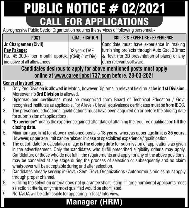 | Junior Chargeman Civil | DAE Civil | Candidates have experience in making furnishing projects through AutoCAD, 3D-Max, and Revit or any other relevant software |