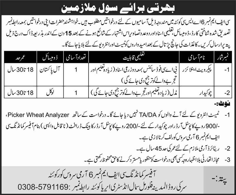 - Candidates have to post their application with a CV to the CFM # 6 ASC Quetta within 15 days.