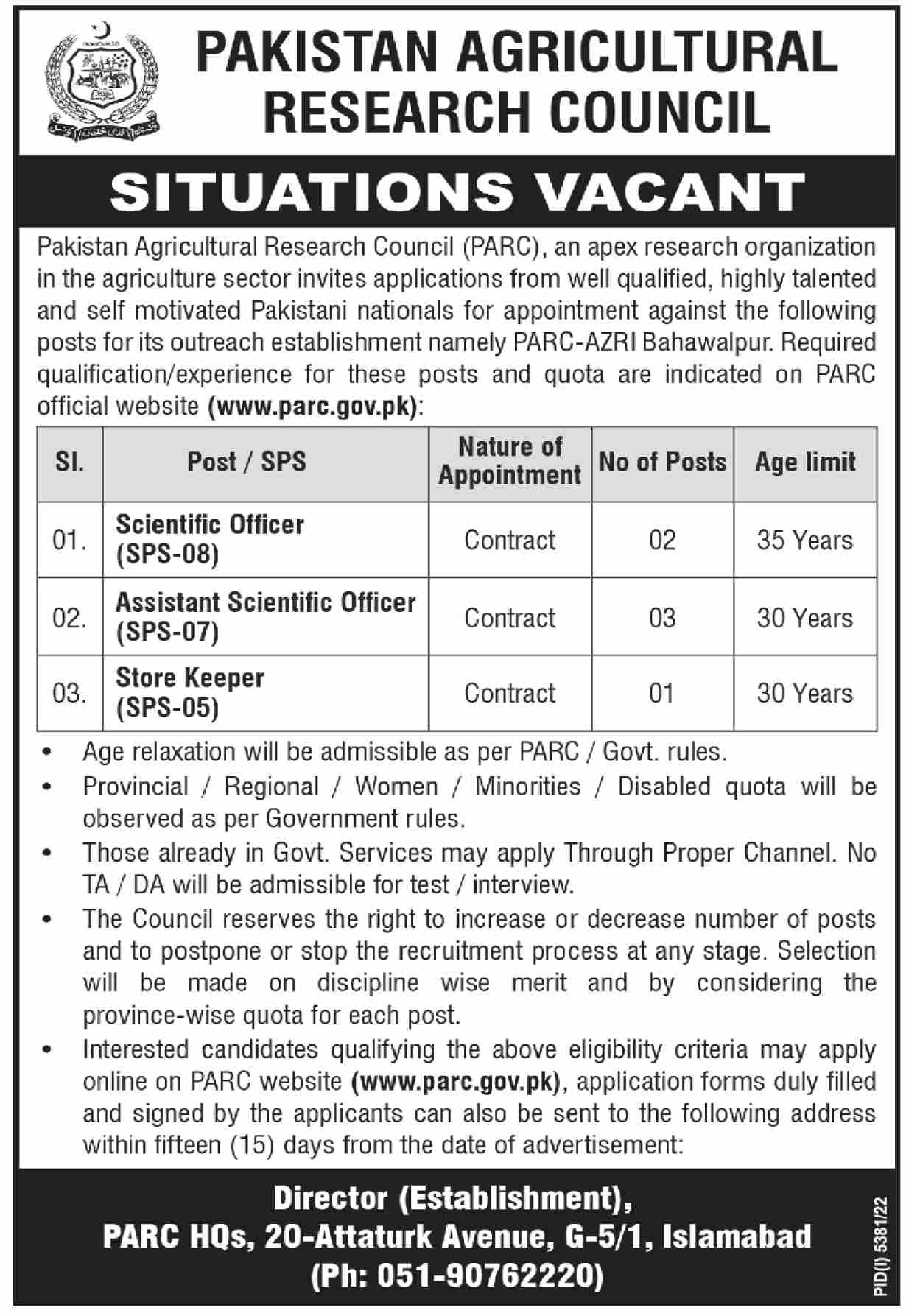 The Pakistan Agricultural Research Council (PARC) announced the following positions.