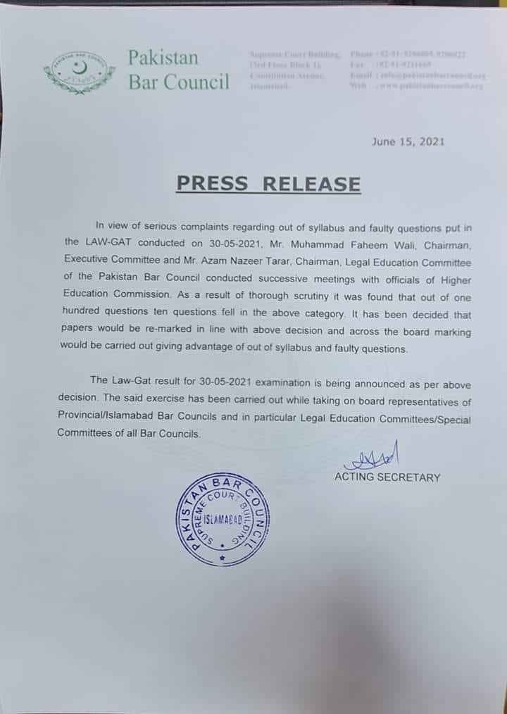 On 15 June 2021, the Pakistan Bar Council (PBC) issued a notification regarding the decision to remark on the LAW-GAT 2021 papers. The council has received various complaints regarding out of syllabus MCQs in the GAT Test conducted on 30 May 2021. Thus, to sort out this matter, PBC conducted successive meetings with the HEC officials.
