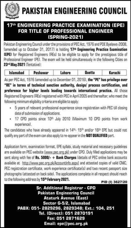 Pakistan Engineering Council (PEC) announced the 17th Engineering practice examination (EPE) Spring 2021 for registered engineers. For the EPE, engineers must have 05 years of practice in the relevant field of engineering. The EPE exam is an integral part of the assessment to get the title of the professional engineer. So, The last date for the registration in EPE is 15 February 2021, while the test date is 23 May 2021 (tentative).