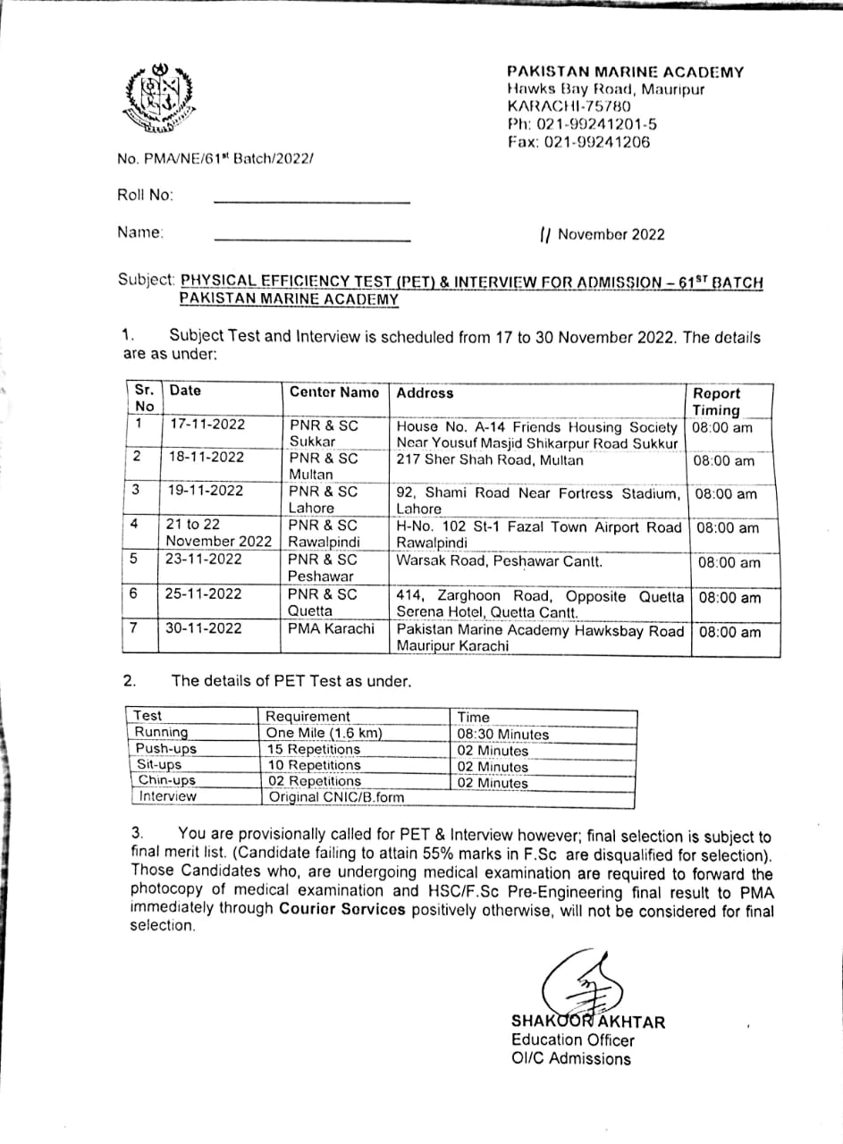 Pakistan Marine Academy (PMA) issued a notification regarding the Physical Efficiency Test (PET) and Interviews for the 61st Batch Admissions. According to the announced schedule, PMA will conduct the test and interviews from 17 November 2022 to 30 November 2022. The PMA has announced the test centers and addresses for all cities. However, the reporting time will be 8:00 AM. below, we have provided the complete PET and interview schedule for the PMA Admissions 2022.
