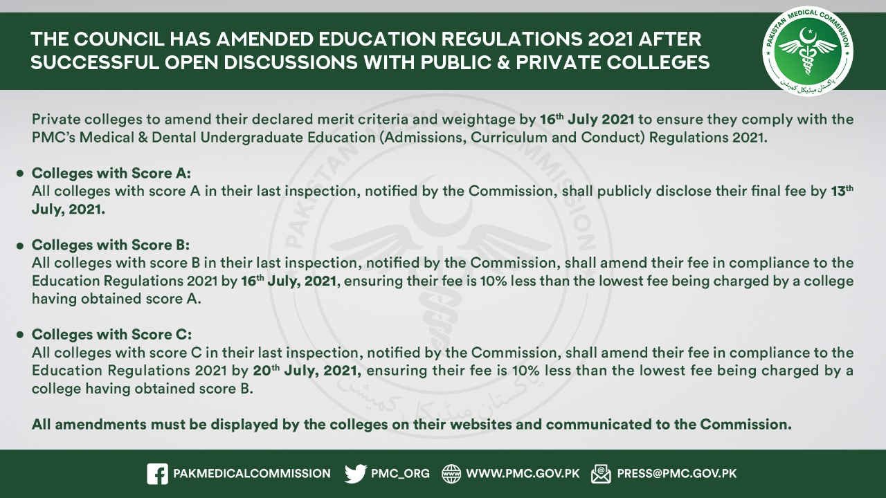 On 12 July 2021, Pakistan Medical Commission announced the notification regarding amended Education Regulations 2021. The commission made amendments after the successful open discussion with public and private medical and dental colleges/universities. Thus, Private institutes./colleges agreed to declare their amended merit criteria and weightage by 16 July 2021.