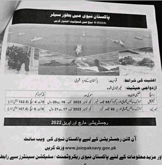 The last date to apply for Pak Navy as Sailor jobs is 26th March 2022