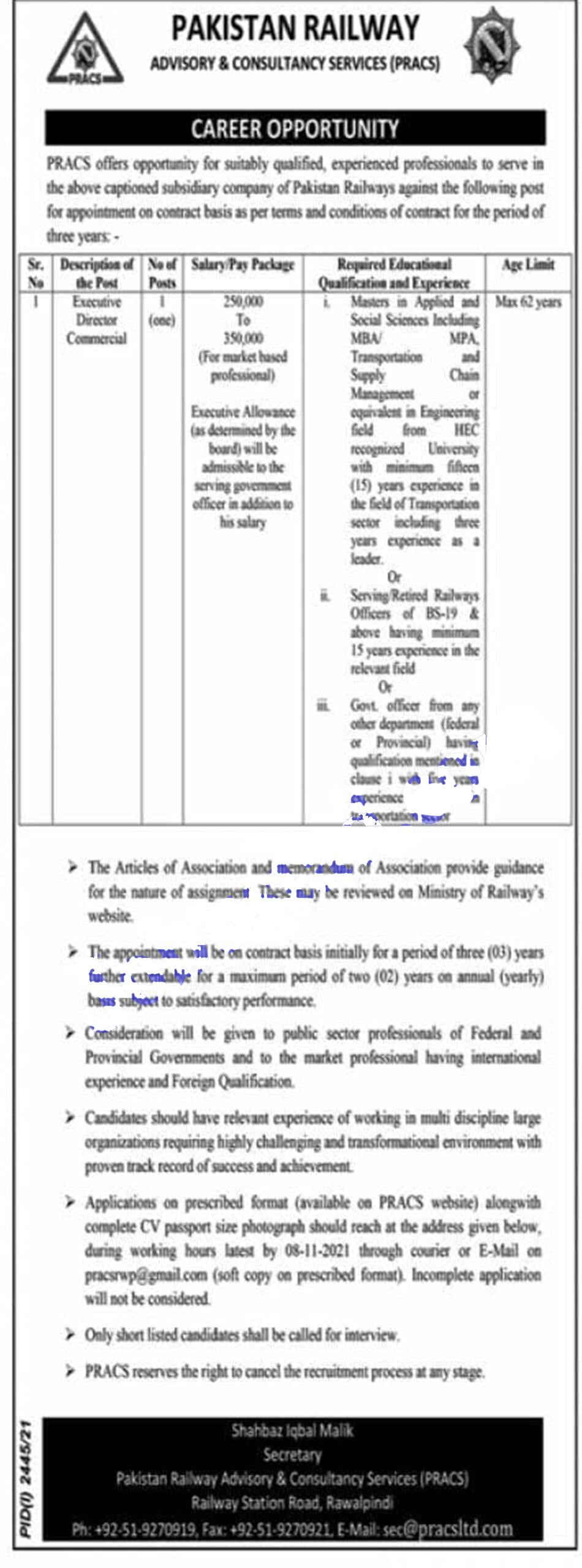 - Application on prescribed format available on PRACS website alongwith complete CV, passport size photograph should reach at the Pakistan Railway Advisory and Consultancy Services Railway station road, Rawalpindi