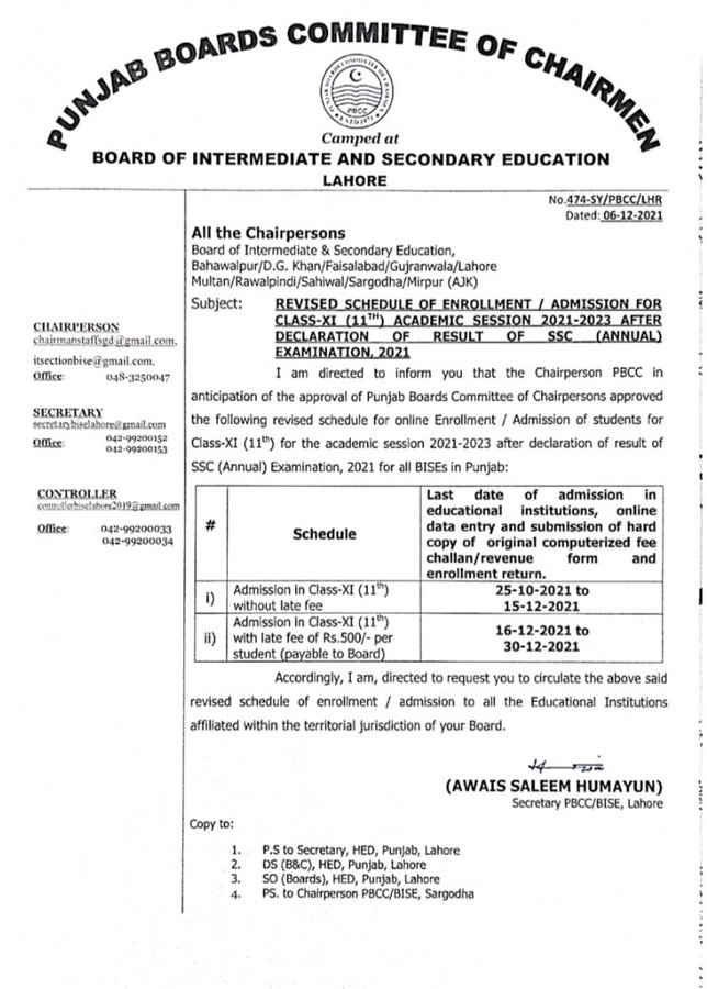 The Punjab Board Committee of Chairman (PBCC) announced a notification regarding the revised schedule of 11th class admissions 2021-23. According to the latest notification, students can enroll for the HSSc part-I till 15 December 2021 without any late fees. However, after 15 December, candidates will submit the application with late fees till 30 December 2021. However, the announced PBCC notification is for Punjab BISEs.