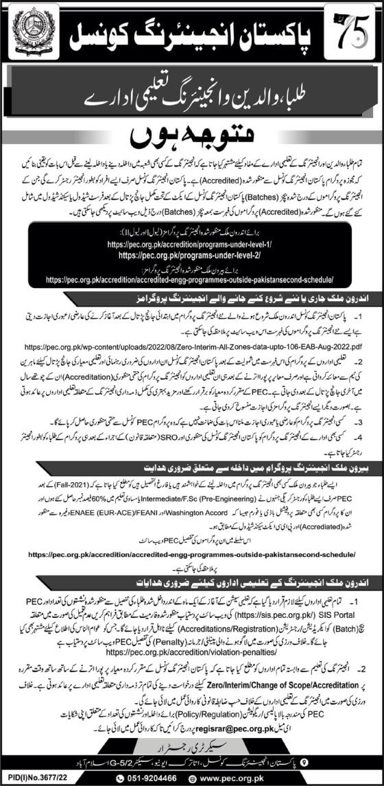 Pakistan Engineering Council (PEC) published an alert notification for the students, parents, and Engineering institutes about the accredited programs. PEC advised the students to check the engineering program accreditation carefully before admission to determine whether PEC accredits the concerned program.