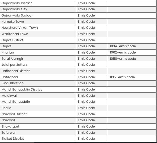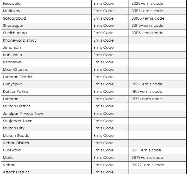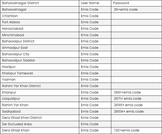 - For example, if the District Code is 10, the Tehsil ID is 25, and the EMIS Code is 12345678, then your password will be 102512345678
