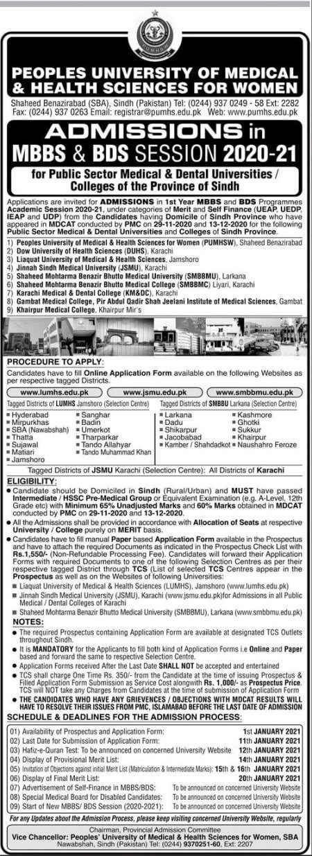Peoples University of Medical & Health Sciences announced the MBBS and BDS admissions 2020-21. So, those students who have cleared MDCAT 2020 can apply for the MBBS/BDS degree. These admissions are for the public medical institutes in Sindh. However, for the admission, the last date to apply is till 11 January 2021