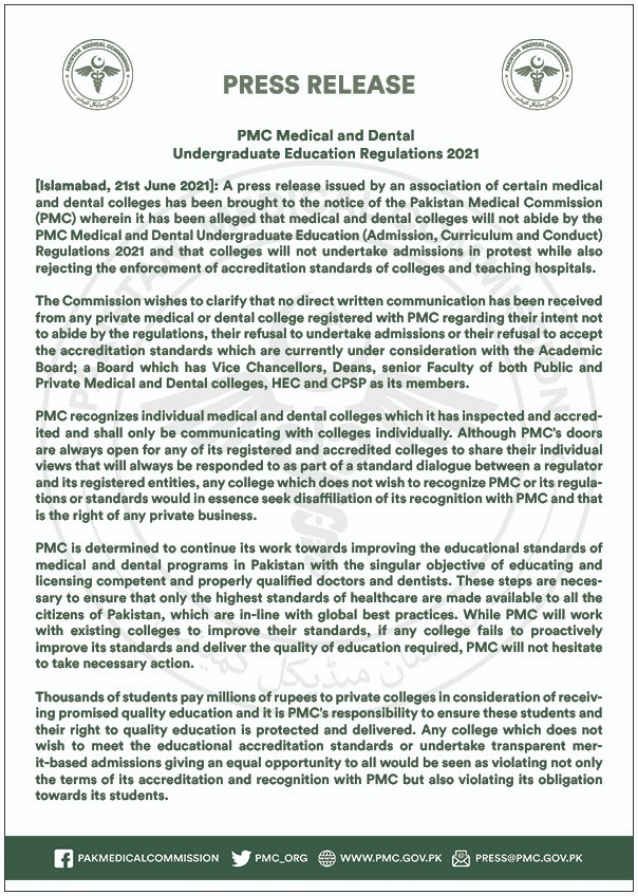 During a press release on 21 June 2021, the Pakistan Medical commission instructed the medical institutes to ensure the education standards. The commission is determined to continue its working towards improving the educational standards for medical and dental education. The purpose of these standards is to produce qualified doctors and dentists. Thus, all the affiliated colleges with PMC must implement these measurements to deliver quality education.