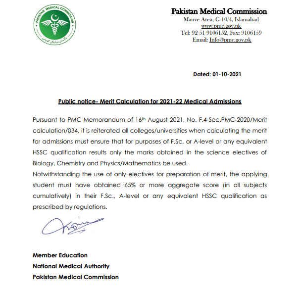 Recently, the Pakistan Medical Commission issued the merit calculation method for the medical admission 2021-22. PMC stated that this year colleges would make merit according to the HSSC elective subjects marks only. Like this year, the government took the exams of only elective subjects (Chemistry, Biology, & Physics), so merit will be based on the obtained marks of these subjects.
