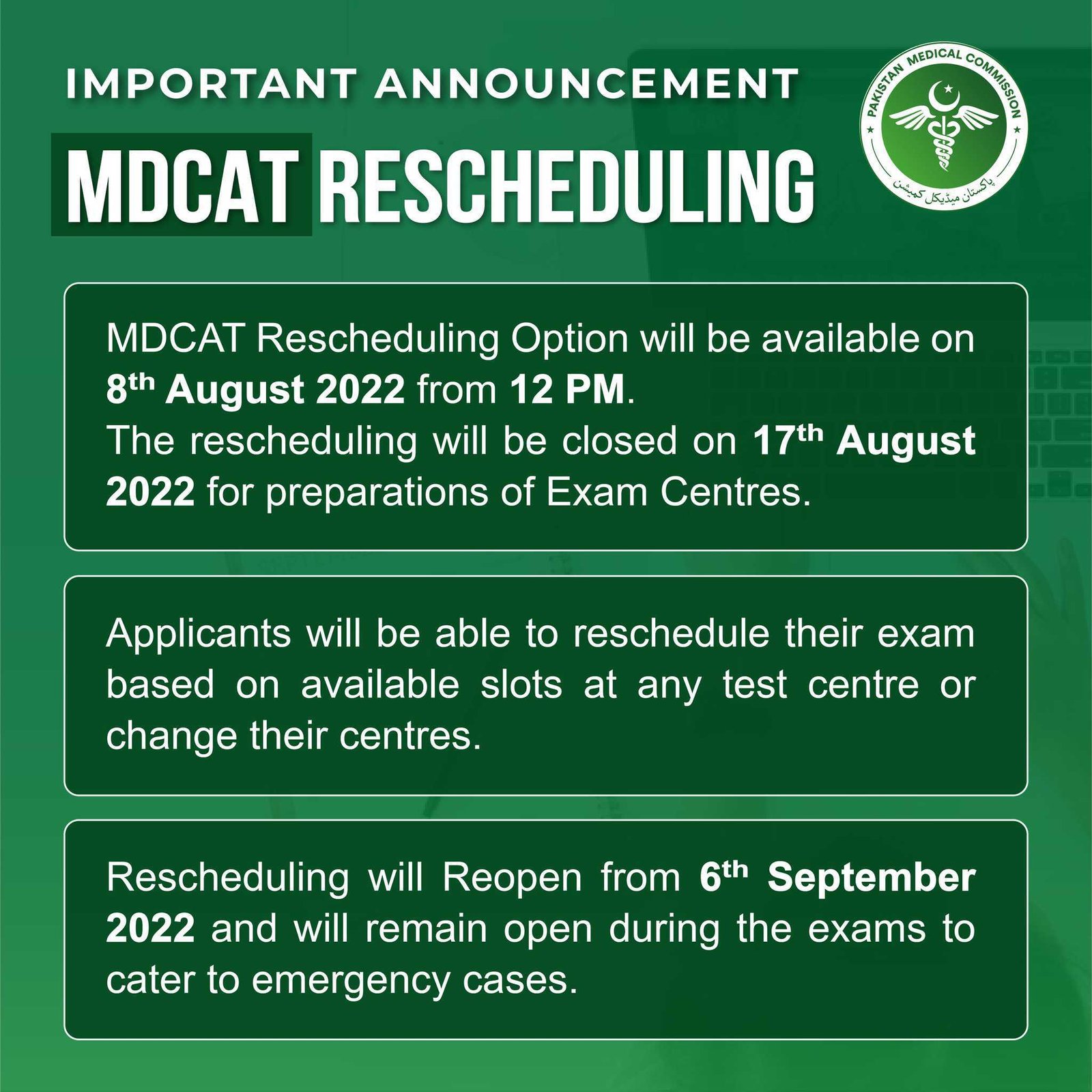 The Pakistan Medical Commission PMC notified the rescheduling of the Medical and Dental Colleges Admissions Test. According to the details, PMC will now give MDCAT a rescheduling option on 8th August 2022, at 12:00 PM. The rescheduling option will close on 17th August 2022 to prepare for the Exam center. Applicants can easily reschedule their exams based on available slots at any test center or change their centers. The rescheduling will reopen on 6th September 2022 and remain open during the exams to cater to emergency cases. PMC issued this notification on Twitter.