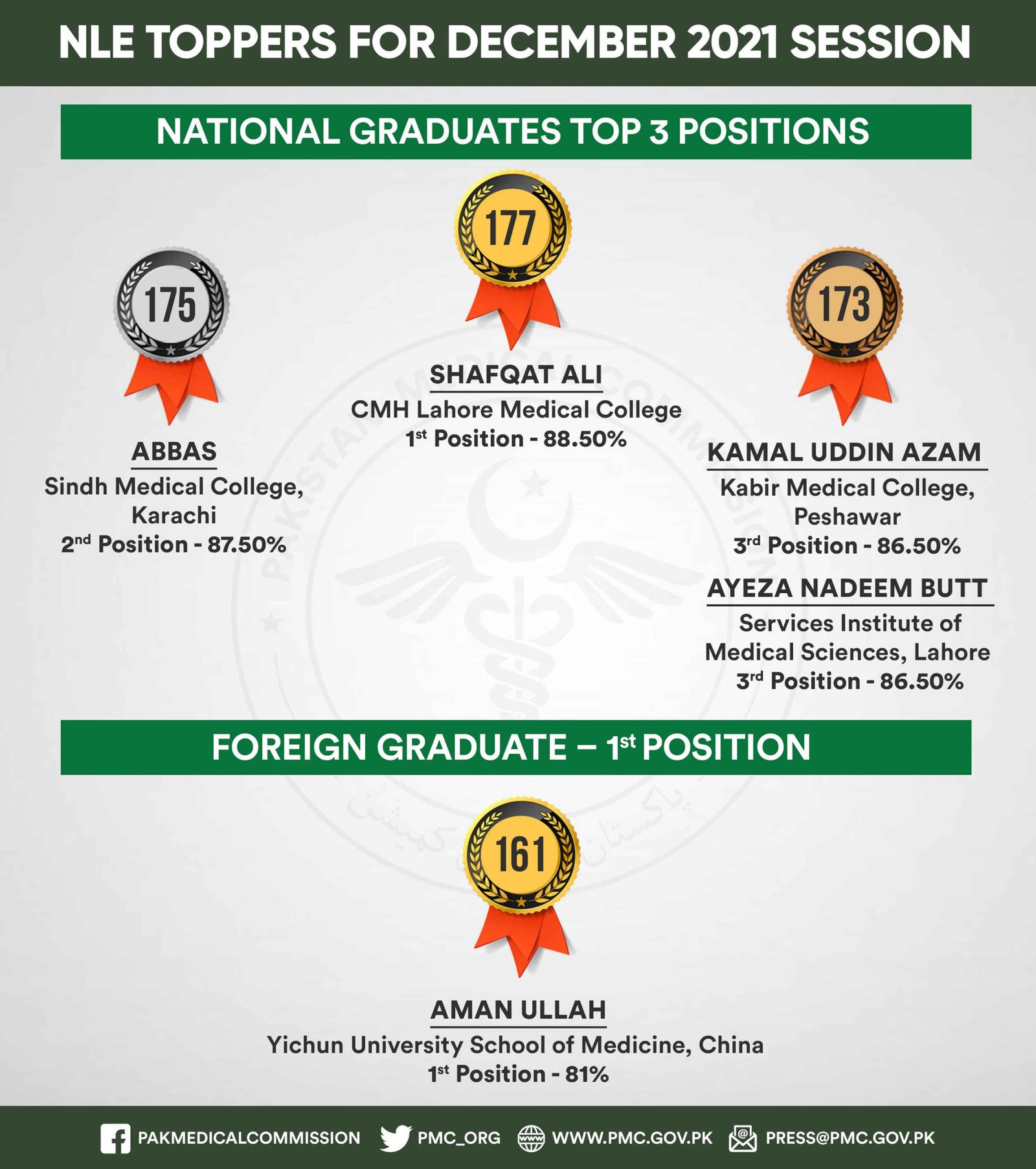 The PMC also announced the NLE step-I December 2021 national and international graduates toppers/position holders. However, 4 National candidates secured 1st three positions. At the same time, PMC announced one international candidate securing the 1st position. Below are the details of all NLE Step-I Tppoers.