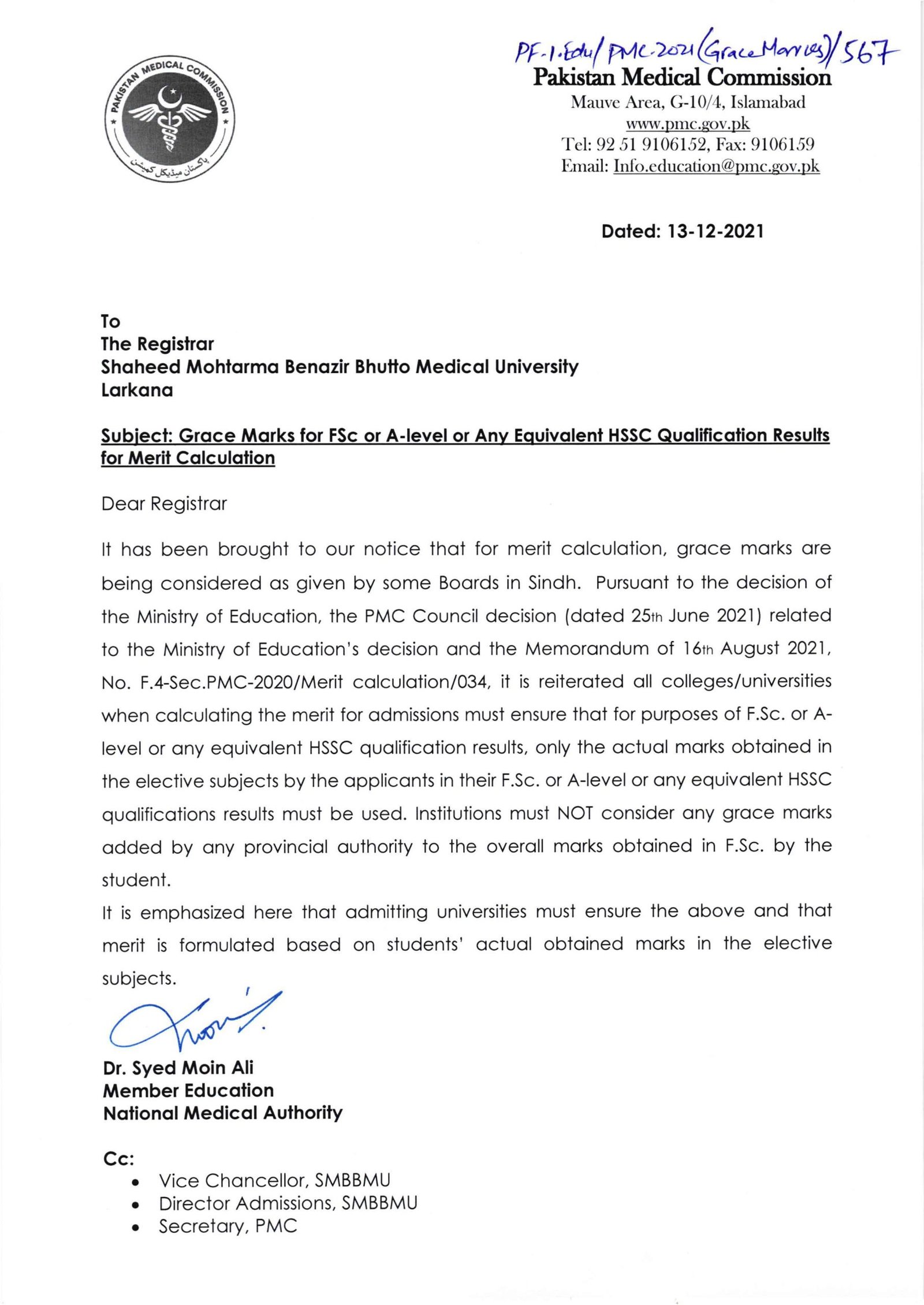 Along with the MDCAT Marks, PMC also issued a letter regarding the grace marks in HSSC for the MBBS/BDS merit calculation. PMKC stated that some boards in Sindh add the grace marks for the Merit calculation. PMC provided the reference of the Ministry of Education, PMC Council decision taken on 25 June 2021.