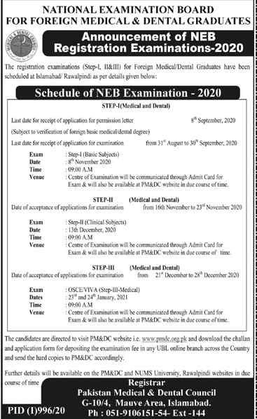 In a notification issued on 25-08-2020 at the PMDC website, the National Examination Board scheduled the registration of exams 2020. The exams will start from 08 November 2020, and NEB decided to conduct in three steps. These exams are for foreign Medical/Dental graduates.