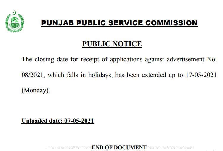 According to the recent notification of PPSC, the commissions has extended the last date for advertisement # 08/2021. The Punjab Public Service Commission extended the date because the prior date falls on the Holidays. Thus, now the extended date for the PPSC advertisement # 08/2021 is 17 May 2021.