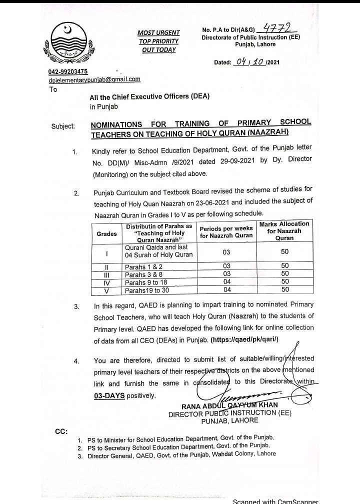Recently, Punjab Government issued a notification for SED regarding the primary teachers training on Naazrah. The notification stated that PCTB revised the studies scheme about teaching the Holy Quran in June 2021. According to that, the subject of Naazrah Quran has been included in the curriculum of grade I-V. However, in these classes, students will complete the Holy Quran according to the following Schedule.