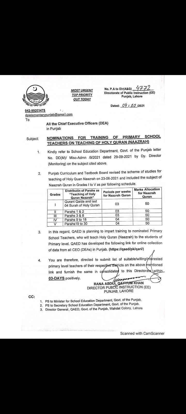 So, to complete the syllabus within the time accurately, the QAED has planned to train the primary teachers. For this, QAED has made a link where all DAEs will provide the data of the nominated teachers. However, for further updates, visit our website. Below is the official notification regarding the primary teachers’ training for Naazrah.