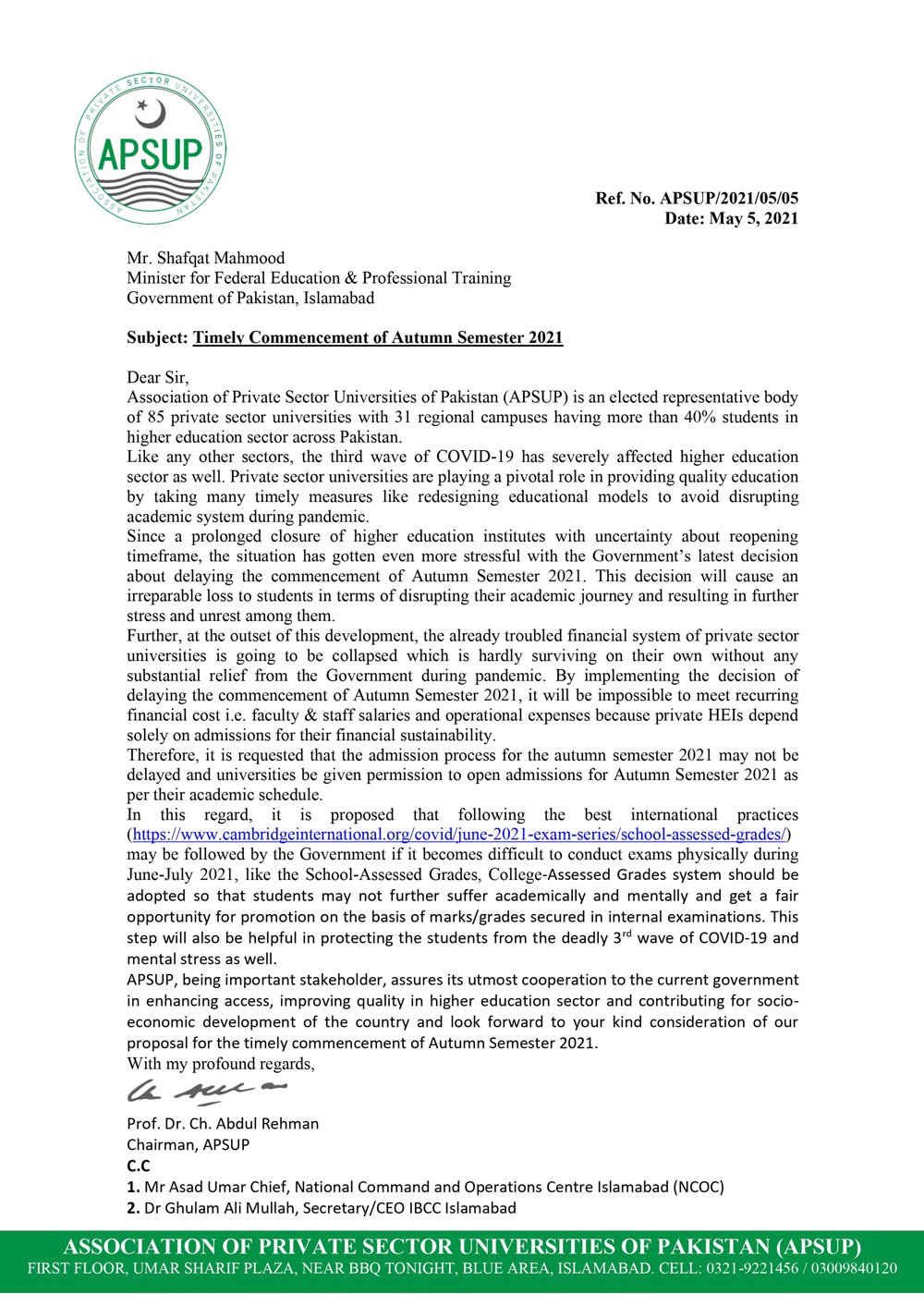 On 05 May 2021, the Association of Private Sector Universities of Pakistan (APSUP) demanded the time commencement of the Autumn 2021 Semester. The association requested Autumn 2021 to the Federal Education Minister Shafqat Mahmood. In the notification, APSUP stated that it is a representative body of around 85 universities having 31 regional campuses.