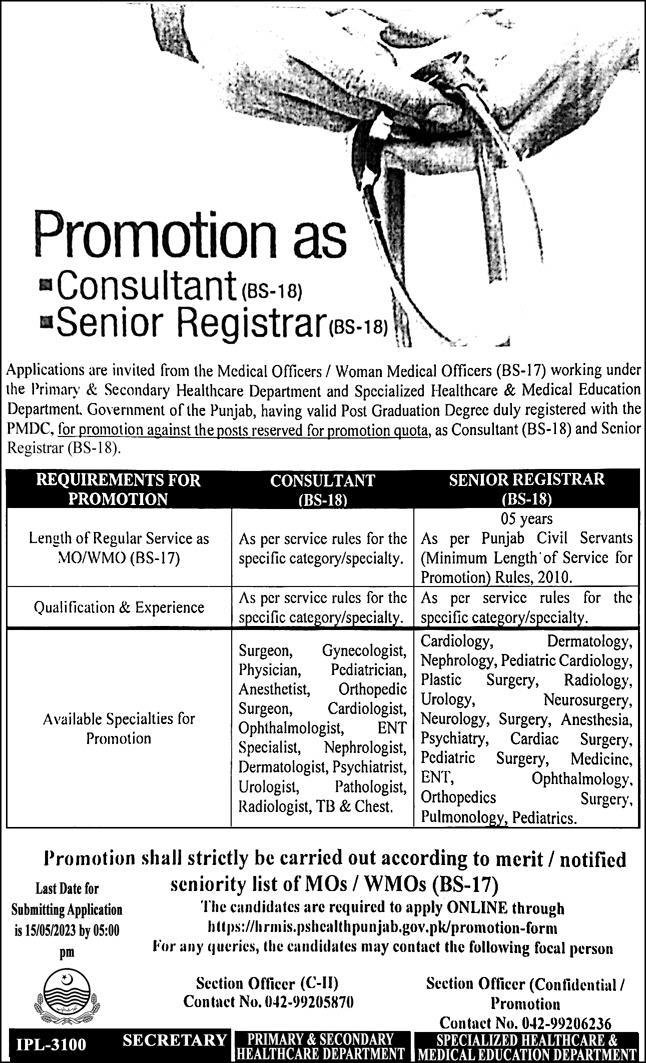 The Punjab Primary & Secondary Healthcare Department (PHSD) advertised a notification regarding the promotion of the Working Medical Officers/Women Medical Officers (BS-17). So, the MO/WMO having a valid Postgraduation degree registered with PMDC can apply for the promotion quota as Consultant and Senior Registrar (BS-18). The Department will promote the candidates based on the merit/notified seniority list of MO/WMOs. However, the last date to apply for the promotion is 15 May 2023. Below, we have provided the complete detail about the PSHD MO/WMO Promotion 2023.