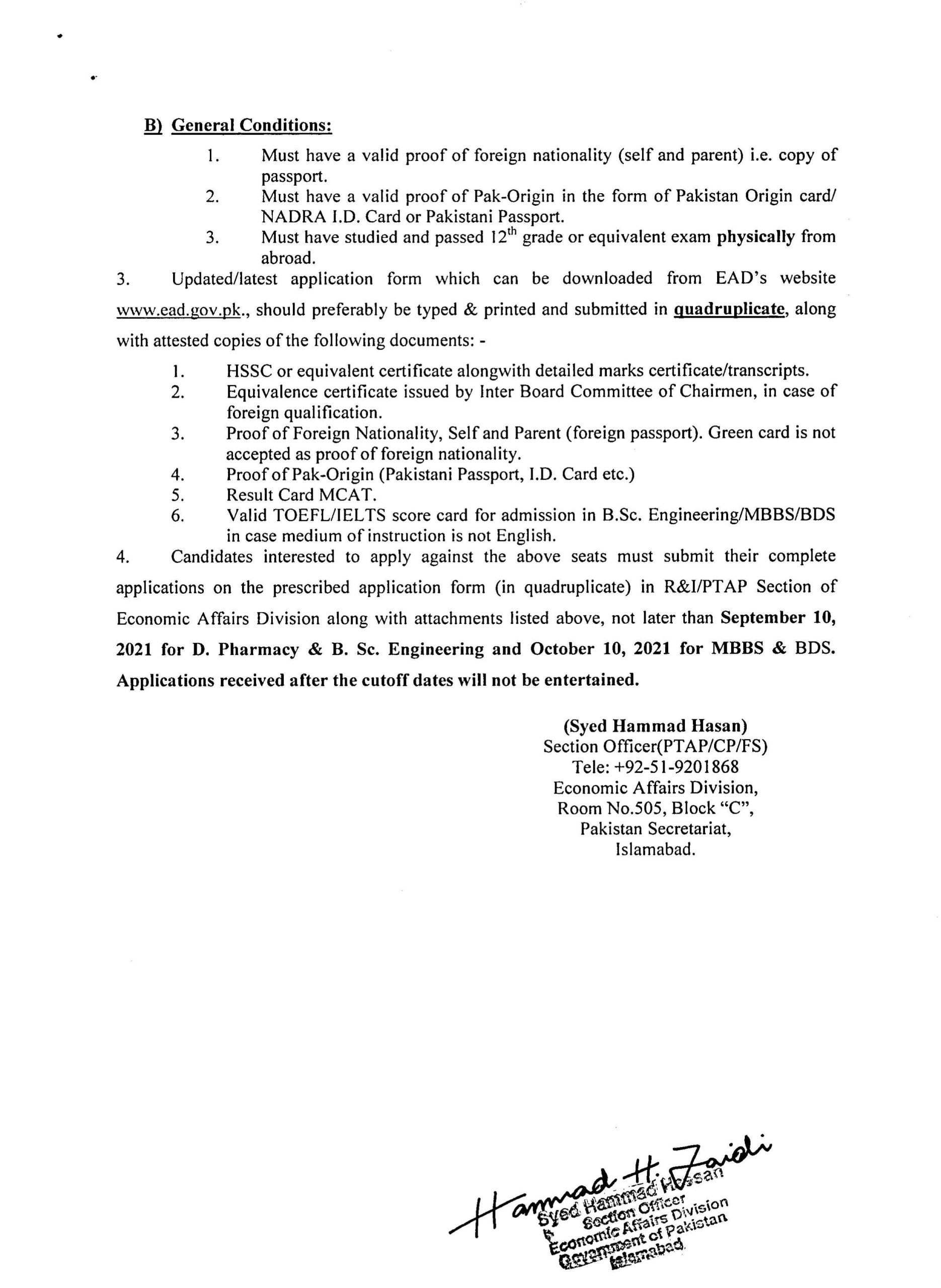 The Ministry of Economic Affairs, Economic Affairs Division, Pakistan, has announced the admissions 2021. These admissions are for the students of Pakistan having Foreign nationality. However, the announced admissions are for the MBBS, BDS, BSc Engineering, and D. Pharmacy programs. The government has announced limited seats for the admissions, so eligible candidates must apply without any delay. Thus, candidates can get the application form from the EAD website and submit it with all required documents. However, the last date to apply for the EAD admissions is 10 September 2021 for D. Pharmacy and BSc while 10 October 2021 for MBBS and BDS.