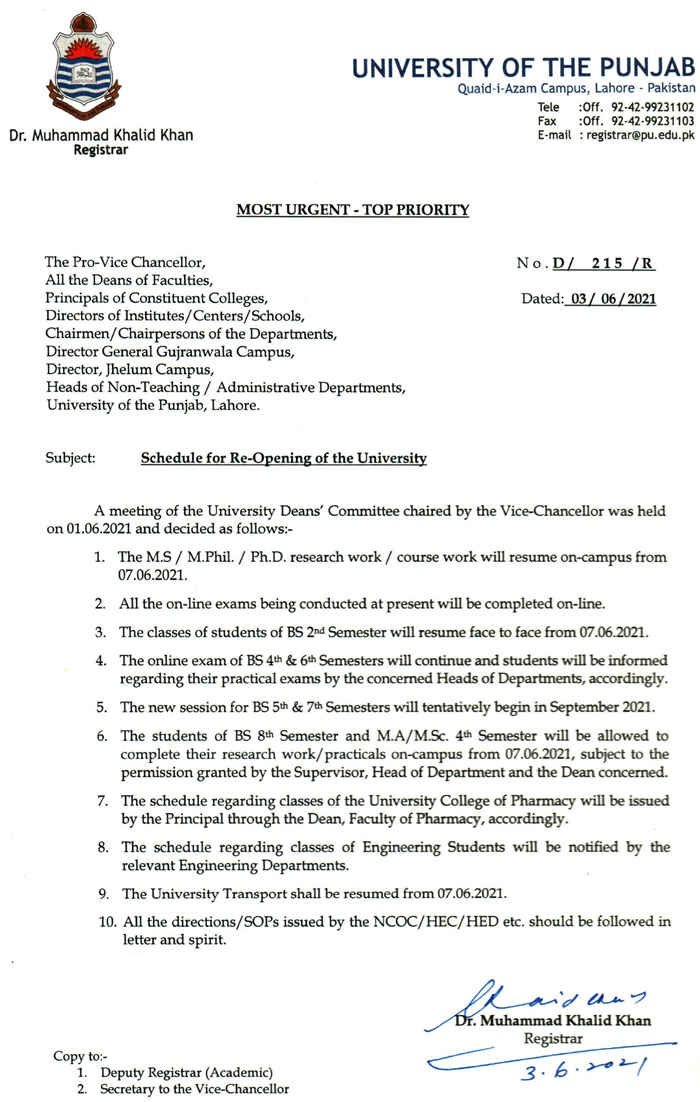 On 03 June 2021, Punjab University announced the notification regarding the reopening of the university from 07 June 2021. However, PU announced the schedule under notification No. D / 215/ R. According to the notification, a meeting of the university dean and VC on 01 June 2021 was held about the reopening of the university.