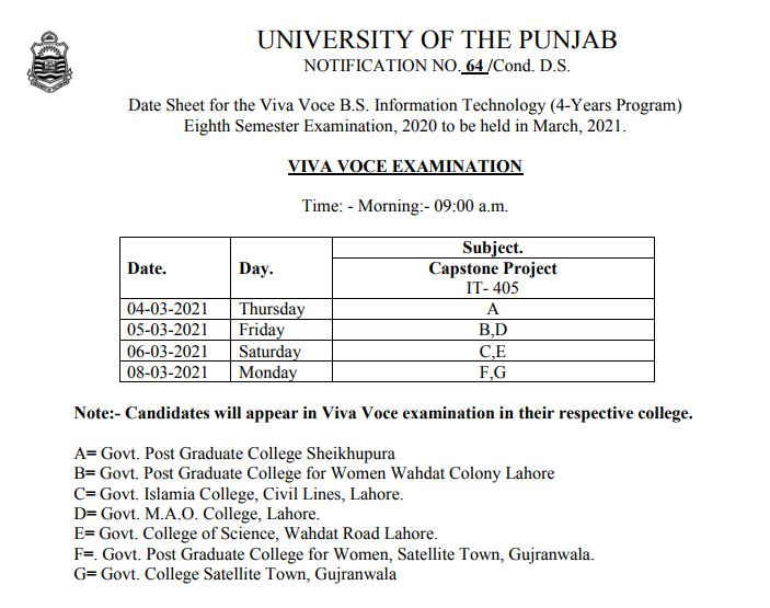 On 01 March 2021, the Punjab University announced the viva voce schedule for the B.S. Information Technology 8th semester. The 1st viva will be on 04 March 2021. However, the P.U. announced the schedule under notification No. 64/Cond. D. S.