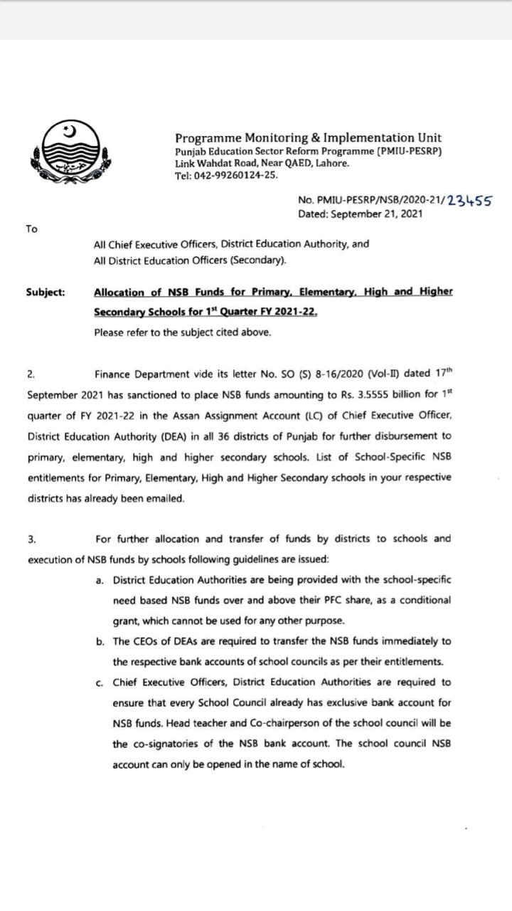 However, for further updates regarding the NSB funds 2021-22 for all schools in Punjab, see the notification given below. However, you can also visit us for the latest updates.