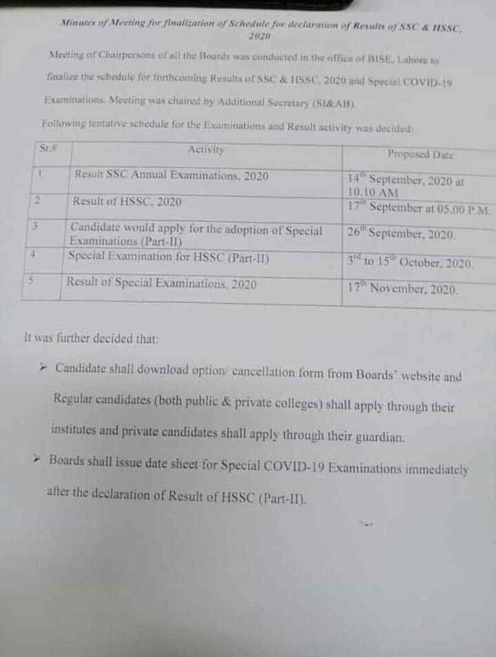 | Declaration of HSSC annual examination Result 2020 | 17th September 2020 at 5:00 pm |
