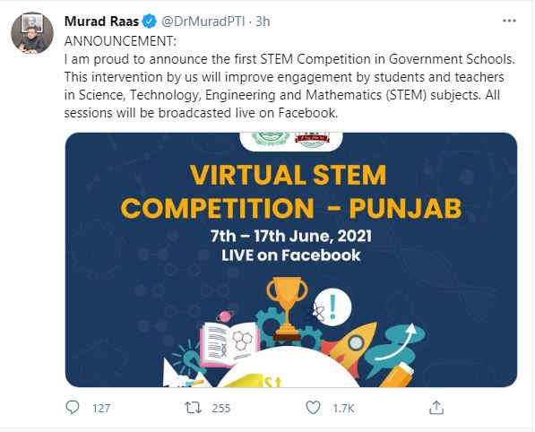 Today, on 05 June 2021, Punjab education Minister Murad Ras Announced the 1st virtual STEM Competition. It will be the 1st ever virtual competition in the Punjab government schools. However, the completion will be between 07 to 17 June 2021. According to the news, the government will broadcast the session live on Facebook.