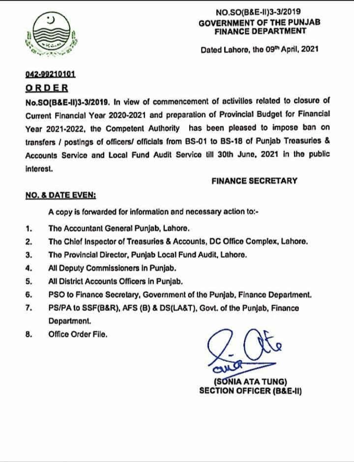 On 09 April 2021, the Finance Department of Punjab issued a notification regarding the ban on officer transfer. The departmnet issued this notice under notification No.SO(B&E-II)3-3/2019.