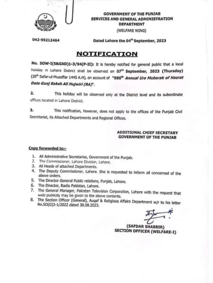 The government of Pakistan issued a notification regarding the local general public holiday in Lahore. According to the latest notification, the government of Punjab Services and General Administration Department officially announced a public holiday in the Lahore district on September 07. The holiday is connected with the 20th Safar ul Muzaffar 1445.AH on account of 980 annual Urs Mubarak Of Hazrat Data Ganj Bakhshali Hajveiri RA. This holiday is only announced for Lahore. The rest of the other Punjab cities will go to their duties as per schedule. This holiday is applicable to all departments and offices other than the Punjab Civil Secretariat and its relevant departments attached to it and Regional Offices. The working in these mentioned offices will continue during the holiday. Additional chief Secretary government of Punjab also Signed the notification regarding the celebration of Urs Mubarak of Hazrat Data Ganj Baksh Ali Hajveiri.
