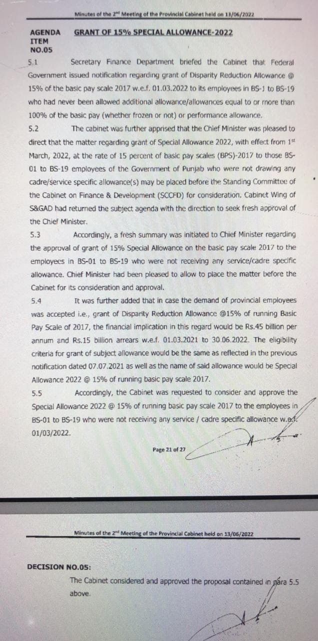 The cabinet requested to consider and approve the special announcement at the running basic pay scale instead of the initial stage to employees who are not receiving any other service or cater specific allowance. Employees of Punjab government will receive the special allowance with the effect from 1st of March 2022 and the areas of months April may June will be received in July salaries.