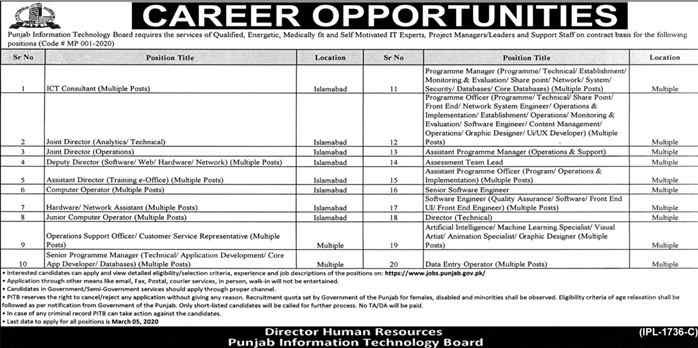 Punjab Information Technology Board (PITB) announces new job vacancies in Lahore for the year 2020. PITB offers various jobs in IT departments. The candidates from different cities are encouraged to apply. The candidate who is serving in the government and private sector should apply through proper channel. These computer operator’s jobs are available in Islamabad and multiple cities. This is a full-time job. Both male and female can apply. This job is published in different newspapers.