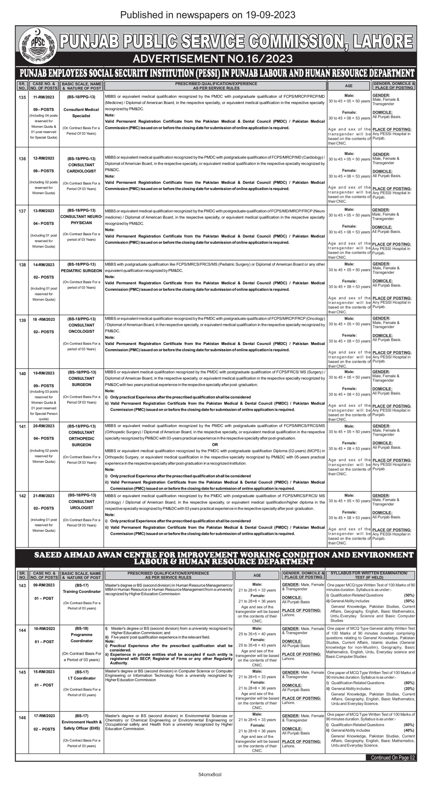 02 | Consultant Cardiologist | BPS-18 | 08 | -do- |