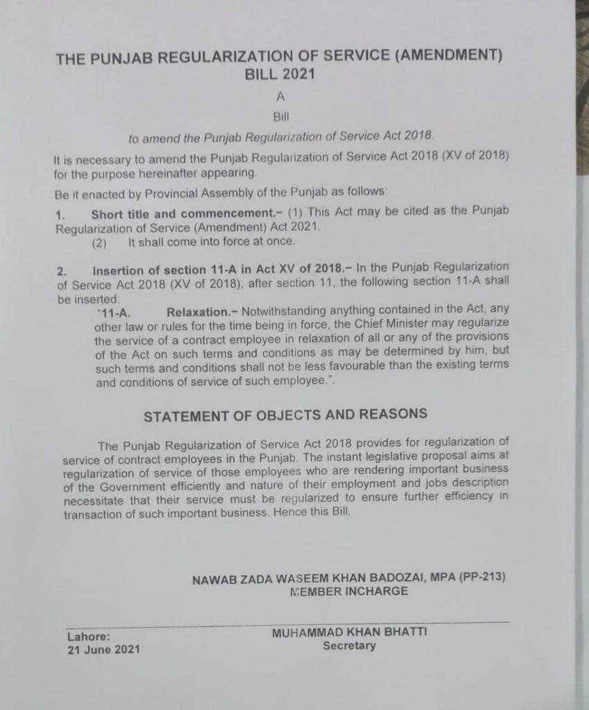 Recently, the Punjab Ministry of Law has issued a notification regarding the amended bill 2021 for Punjab regularization of services. The presented bill is the amended form of the Punjab Regularization Service Act 2018. According to the issued notification of the bill, the ministry has asked to change the previous bill 2018 according to the following.