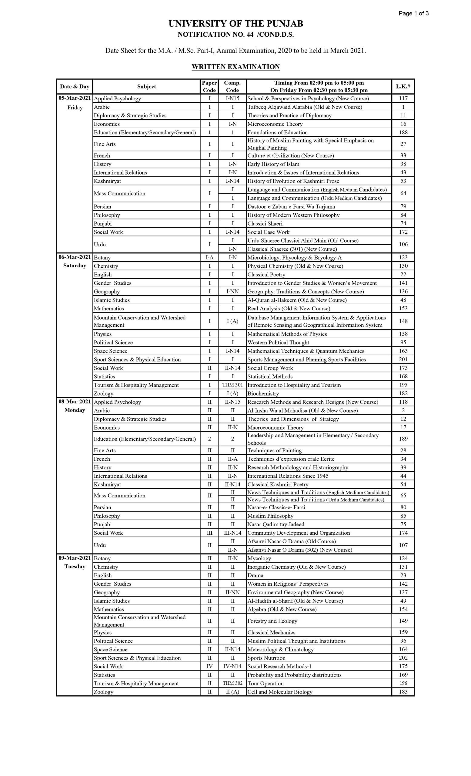 It is to inform all that the University of Punjab issued the date sheet of the MA and MSc Part-I Final examination 2021. Students get ready as the exams are going to start from 5th March 2021 and will continue till 17th March 2021. It is the golden time for students to start their preparation. It is also mandatory to follow SOP strictly which is issued by the government. Not only this, but the Vice Chancellor also issued the notification regarding viva voice and thesis. However, the viva and thesis will be communicated to the candidates directly by the Chairmen/Head of the Departments concerned. According to the details, the duration of exams is from 2:00 PM to 5:00 PM except on Fridays. On Fridays, exam timings will be from 2:30 PM to 5:30 PM.