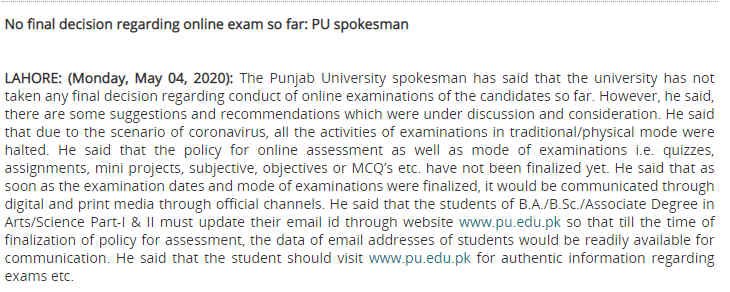 On 04 May 2020, Punjab University Lahore spokesman stated the Online exams. He said that there has not any final decision been taken yet about the online examination of students.