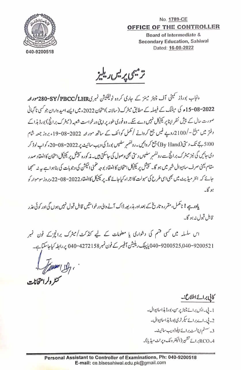 Sahiwal Board has issued a notification on the PBCC decision to conduct the SSC Practical Exams 2022 again. The board again announced the SSC Practical Exams for students absent from the annual practical exams. So, the absent students can now submit the documents to the board office and appear in the Matric Practical exams. The last date to apply for practical exams is 19 August 2022 (5:00 PM). However, the board will accept the applications submitted by hand only. The application fee for the Practical exams is Rs 2100/-.