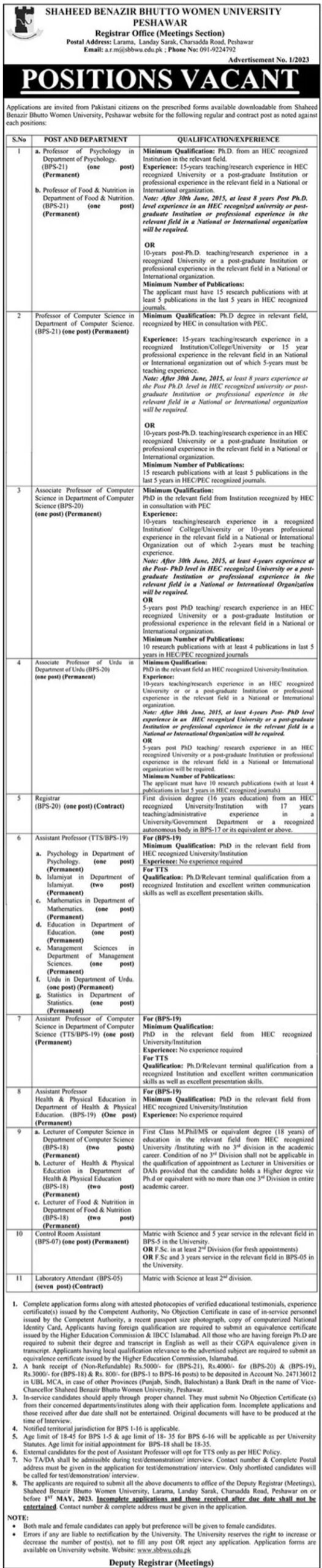 The last date for submission of the SBBWU Women University Peshawar job application is 1st May 2023
