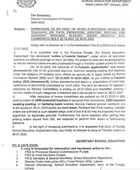 The Punjab School Education Department government issued a notification regarding the merit E-Transfer of Teachers on their promotion. Awaiting postings and hardships grounds. The SED Punjab decided to release promotion and other hardships under process and commenced with effect from 23rd December 2022 to 26th January 2023. Similarly, the orders for teachers awaiting posting and hardships processed through the E-transfer system purely on merit. After getting suggestions from others, they finalized the posting orders of 3599 promoting teachers and 2393 teachers awaiting posting on a hardship basis (widows, divorce, medical grounds, and wedlock).
